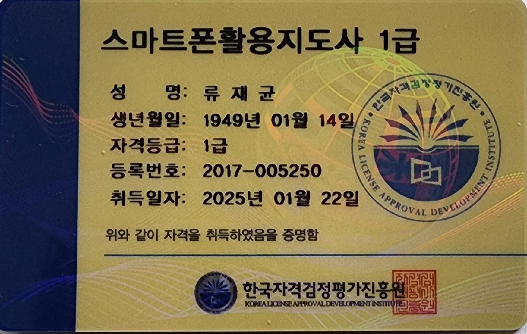 대중교통이 불편한 곳을 차로 실어다 주고 기다리는 동안 집사람이 빨리 생각이 나지 않는 내용에 힌트를 가끔 주는데 4가지 없는 者(노인)가 나에게 자격증이 있냐?고 하여 인터넷 강의로 딴 자격증이다.